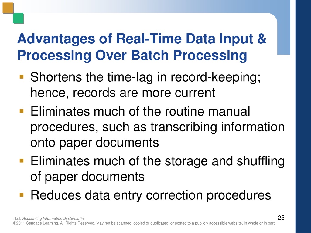 Advantages of Real-Time Data Input & Processing Over Batch Processing • Shortens the time-lag in record-keeping; hence, records are more current • Eliminates much of the routine manual procedures, such as transcribing information onto paper documents • Eliminates much of the storage and shuffling of paper documents • Reduces data entry correction procedures