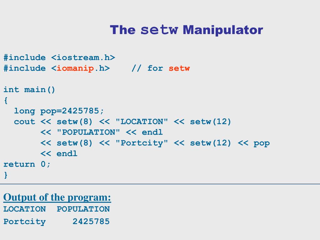 The setw Manipulator #include <iostream.h> #include <iomanip.h> // for setw int main() { long pop=2425785; cout << setw(8) << "LOCATION" << setw(12) << "POPULATION" << endl << setw(8) << "Portcity" << setw(12) << pop << endl return 0; } Output of the program: LOCATION POPULATION Portcity2425785
