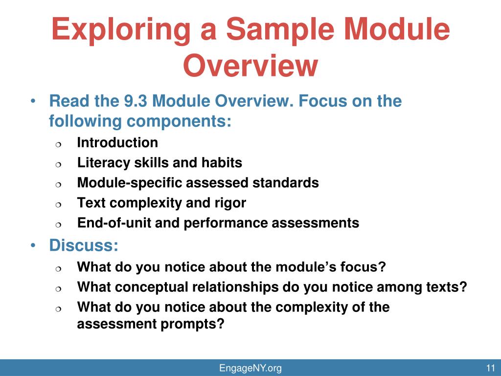 Exploring a Sample Module Overview • Read the 9.3 Module Overview. Focus on the following components: • Introduction • Literacy skills and habits • Module-specific assessed standards • Text complexity and rigor • End-of-unit and performance assessments • Discuss: • What do you notice about the module’s focus? • What conceptual relationships do you notice among texts? • What do you notice about the complexity of the assessment prompts? EngageNY.org