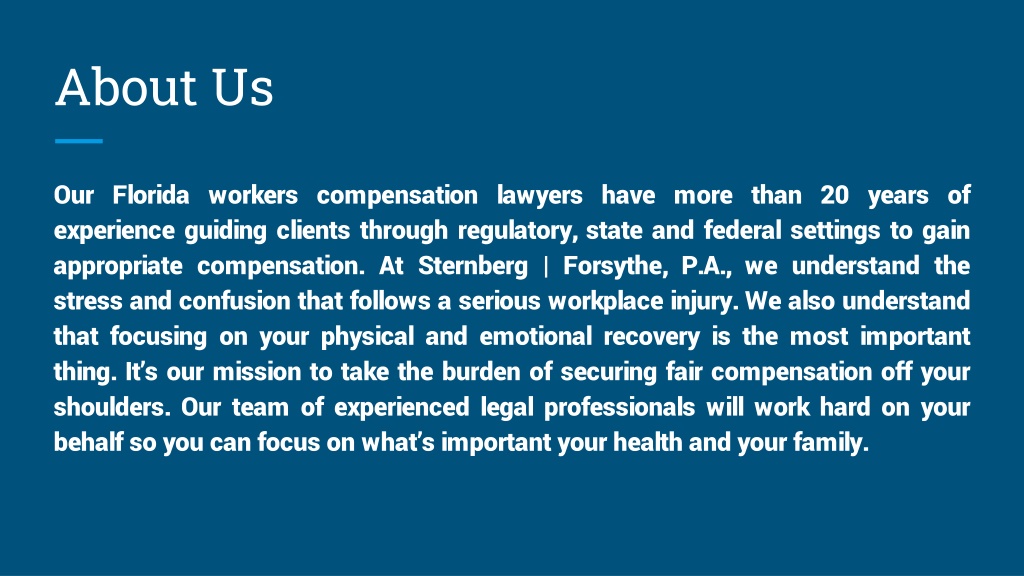 About Us Our Florida workers compensation lawyers have more than 20 years of experience guiding clients through regulatory, state and federal settings to gain appropriate compensation. At Sternberg | Forsythe, P.A., we understand the stress and confusion that follows a serious workplace injury. We also understand that focusing on your physical and emotional recovery is the most important thing. It’s our mission to take the burden of securing fair compensation off your shoulders. Our team of experienced legal professionals will work hard on your behalf so you can focus on what’s important your health and your family.