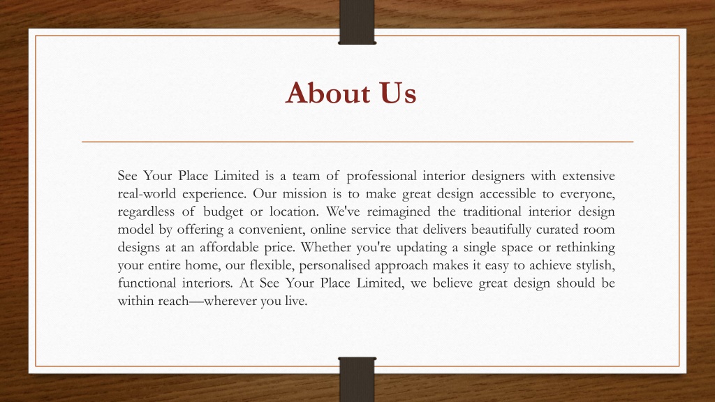 About Us See Your Place Limited is a team of professional interior designers with extensive real-world experience. Our mission is to make great design accessible to everyone, regardless of budget or location. We've reimagined the traditional interior design model by offering a convenient, online service that delivers beautifully curated room designs at an affordable price. Whether you're updating a single space or rethinking your entire home, our flexible, personalised approach makes it easy to achieve stylish, functional interiors. At See Your Place Limited, we believe great design should be within reach—wherever you live.