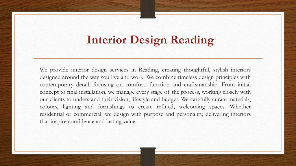 Interior Design Reading We provide interior design services in Reading, creating thoughtful, stylish interiors designed around the way you live and work. We combine timeless design principles with contemporary detail, focusing on comfort, function and craftsmanship. From initial concept to final installation, we manage every stage of the process, working closely with our clients to understand their vision, lifestyle and budget. We carefully curate materials, colours, lighting and furnishings to create refined, welcoming spaces. Whether residential or commercial, we design with purpose and personality, delivering interiors that inspire confidence and lasting value.