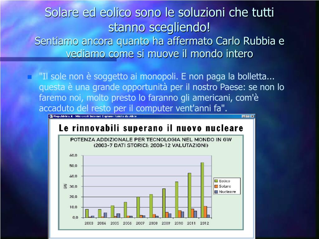 Solare ed eolico sono le soluzioni che tutti stanno scegliendo!Sentiamo ancora quanto ha affermato Carlo Rubbia e vediamo come si muove il mondo intero • "Il sole non è soggetto ai monopoli. E non paga la bolletta... questa è una grande opportunità per il nostro Paese: se non lo faremo noi, molto presto lo faranno gli americani, com'è accaduto del resto per il computer vent'anni fa".