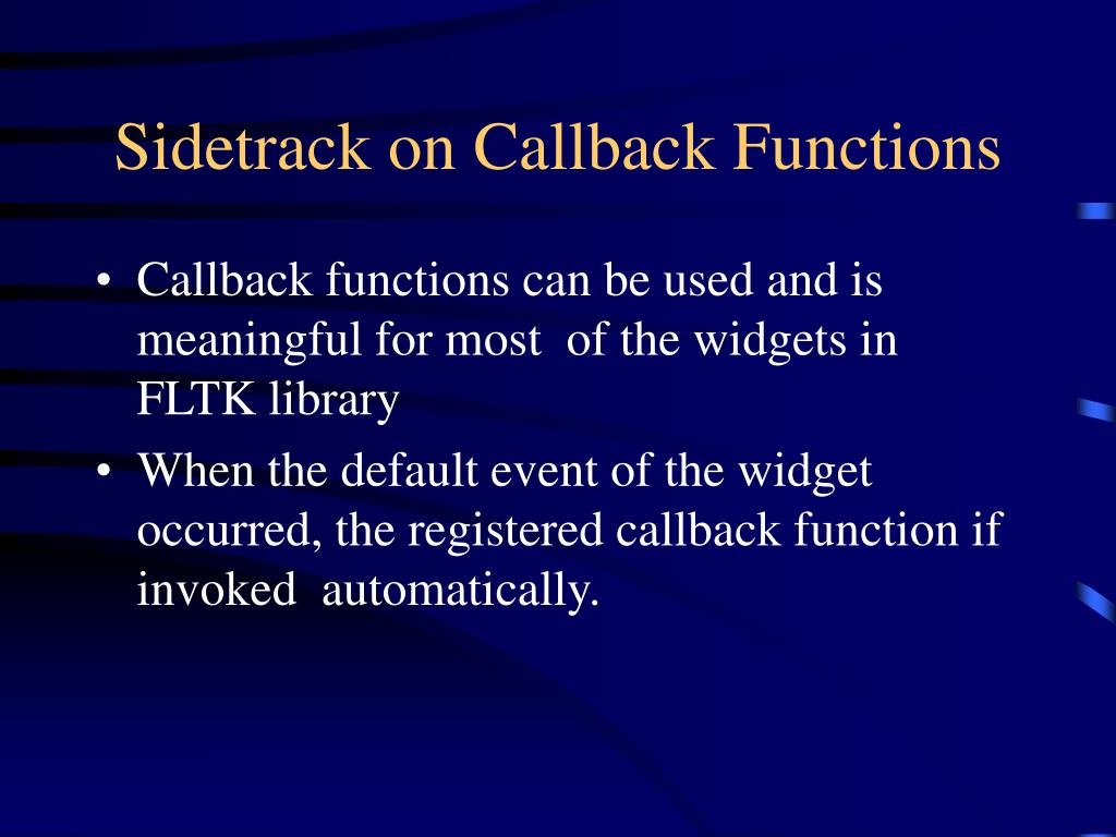 Sidetrack on Callback Functions • Callback functions can be used and is meaningful for most of the widgets in FLTK library • When the default event of the widget occurred, the registered callback function if invoked automatically.