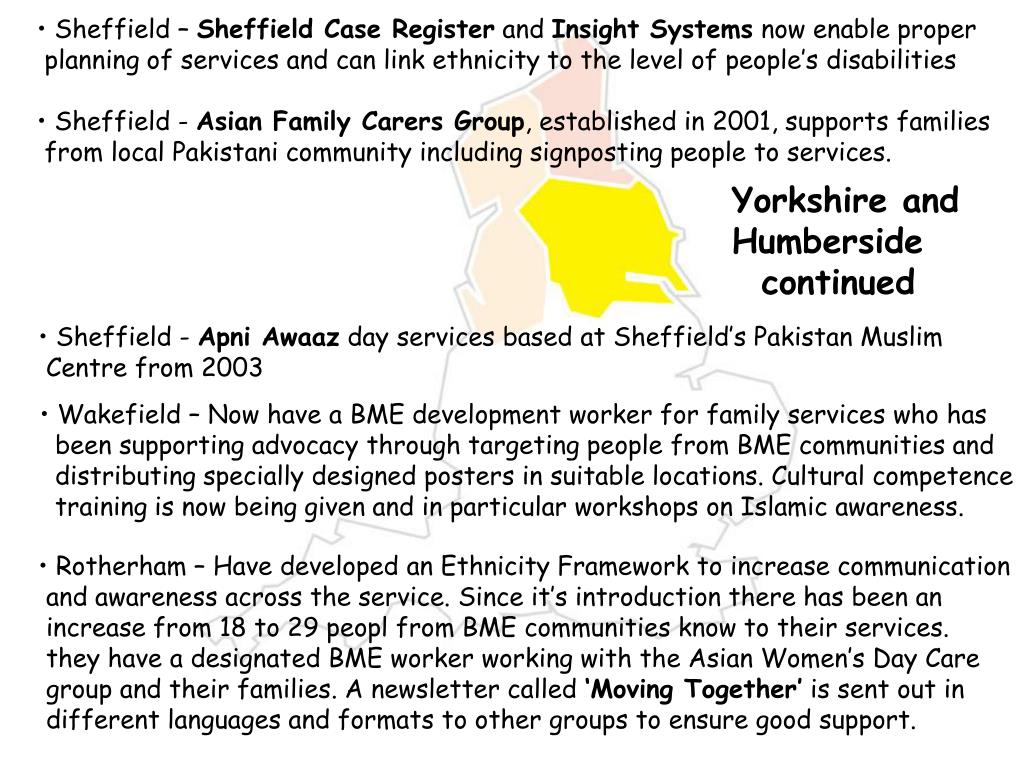Sheffield – Sheffield Case Register and Insight Systems now enable proper • planning of services and can link ethnicity to the level of people’s disabilities • Sheffield - Asian Family Carers Group, established in 2001, supports families • from local Pakistani community including signposting people to services. Yorkshire and Humberside continued • Sheffield - Apni Awaaz day services based at Sheffield’s Pakistan Muslim • Centre from 2003 • Wakefield – Now have a BME development worker for family services who has • been supporting advocacy through targeting people from BME communities and • distributing specially designed posters in suitable locations. Cultural competence • training is now being given and in particular workshops on Islamic awareness. • Rotherham – Have developed an Ethnicity Framework to increase communication • and awareness across the service. Since it’s introduction there has been an • increase from 18 to 29 peopl from BME communities know to their services. • they have a designated BME worker working with the Asian Women’s Day Care • group and their families. A newsletter called ‘Moving Together’ is sent out in • different languages and formats to other groups to ensure good support.