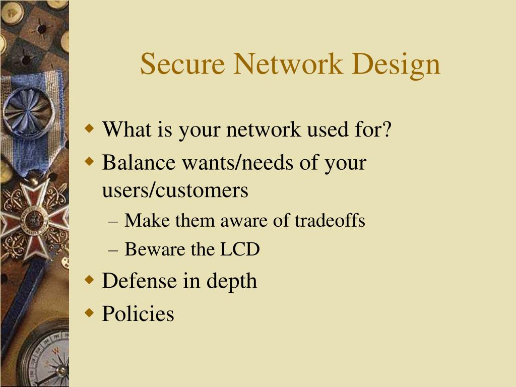 Secure Network Design • What is your network used for? • Balance wants/needs of your users/customers • Make them aware of tradeoffs • Beware the LCD • Defense in depth • Policies