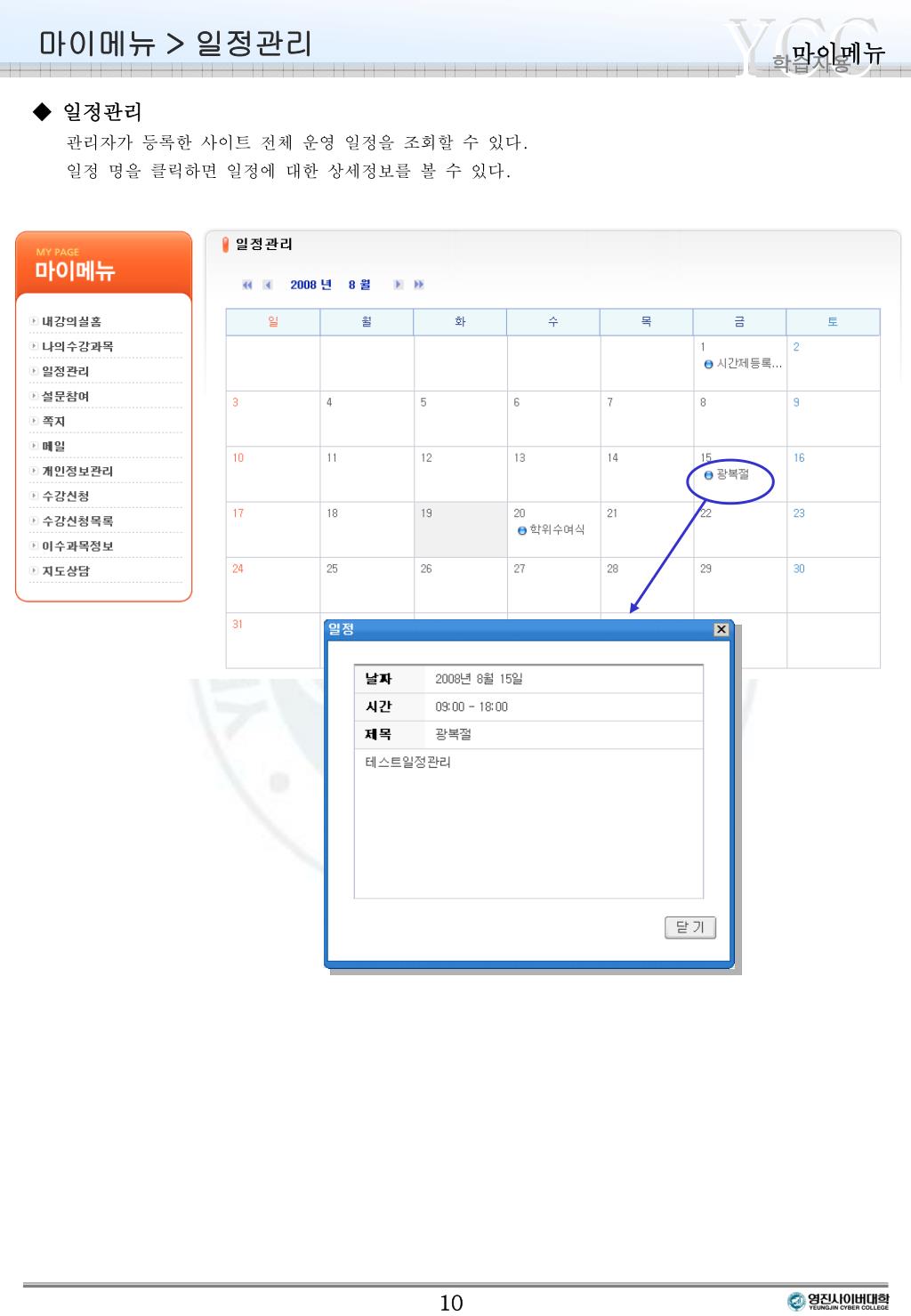 마이메뉴 > 일정관리 마이메뉴 ◆ 일정관리 관리자가 등록한 사이트 전체 운영 일정을 조회할 수 있다. 일정 명을 클릭하면 일정에 대한 상세정보를 볼 수 있다.