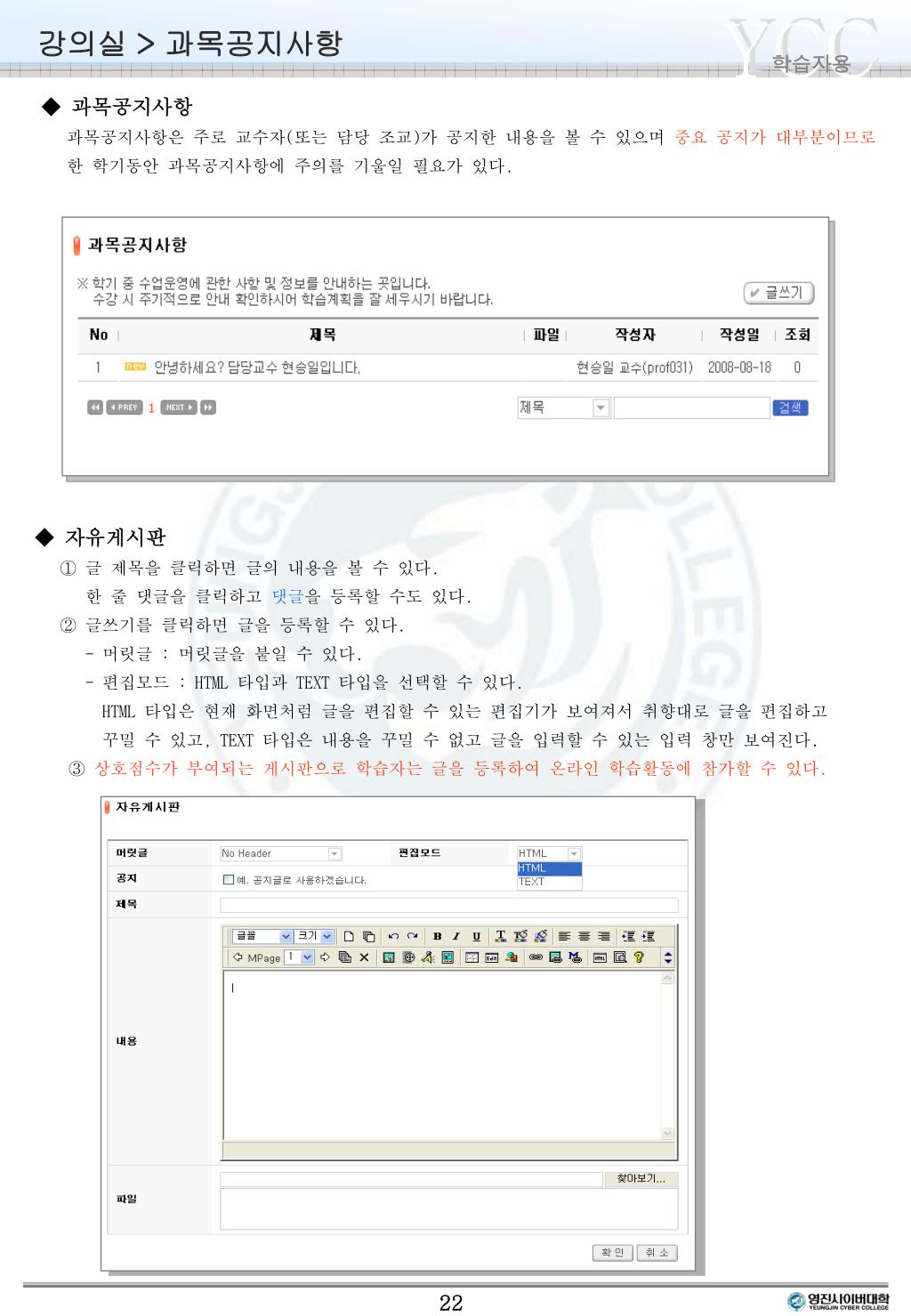 강의실 > 과목공지사항 ◆ 과목공지사항 과목공지사항은 주로 교수자(또는 담당 조교)가 공지한 내용을 볼 수 있으며 중요 공지가 대부분이므로 한 학기동안 과목공지사항에 주의를 기울일 필요가 있다. ◆ 자유게시판 ①글 제목을 클릭하면 글의 내용을 볼 수 있다. 한 줄 댓글을 클릭하고 댓글을 등록할 수도 있다. ② 글쓰기를 클릭하면 글을 등록할 수 있다. - 머릿글 : 머릿글을 붙일 수 있다. - 편집모드 : HTML 타입과 TEXT 타입을 선택할 수 있다. HTML 타입은 현재 화면처럼 글을 편집할 수 있는 편집기가 보여져서 취향대로 글을 편집하고 꾸밀 수 있고, TEXT 타입은 내용을 꾸밀 수 없고 글을 입력할 수 있는 입력 창만 보여진다. ③ 상호점수가 부여되는 게시판으로 학습자는 글을 등록하여 온라인 학습활동에 참가할 수 있다.