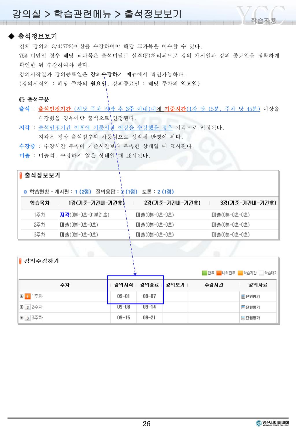 강의실 > 학습관련메뉴 > 출석정보보기 ◆ 출석정보보기 전체 강의의 3/4(75%)이상을 수강하여야 해당 교과목을 이수할 수 있다. 75% 미만일 경우 해당 교과목은 출석미달로 실격(F)처리되므로 강의 개시일과 강의 종료일을 정확하게 확인한 뒤 수강하여야 한다. 강의시작일과 강의종료일은 강의수강하기 메뉴에서 확인가능하다. (강의시작일 : 해당 주차의 월요일, 강의종료일 : 해당 주차의 일요일) ◎ 출석구분 출석: 출석인정기간 (해당 주차 시작 후3주 이내)내에 기준시간(1강 당 15분, 주차 당 45분)이상을 수강했을 경우에만 출석으로 인정된다. 지각: 출석인정기간 이후에 기준시간 이상을 수강했을 경우 지각으로 인정된다. 지각은 정상 출석점수와 차등적으로 성적에 반영이 된다. 수강중: 수강시간 부족이 기준시간보다 부족한 상태일 때 표시된다. 미출 : 미출석, 수강하지 않은 상태일 때 표시된다.