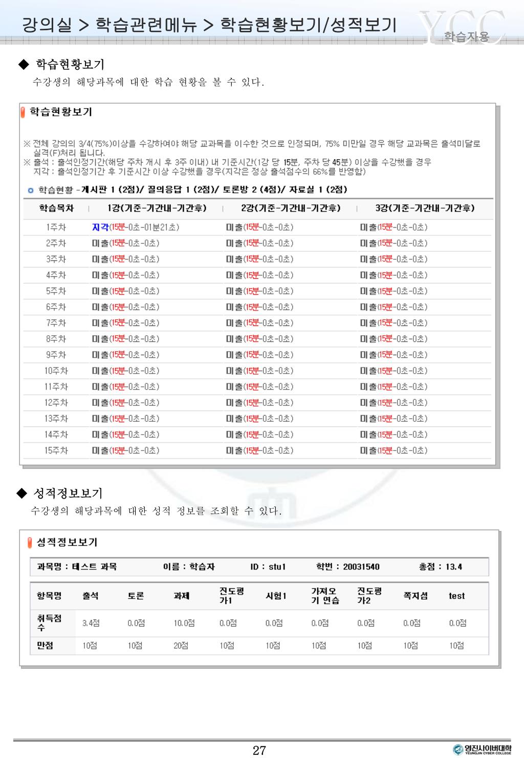 강의실 > 학습관련메뉴 > 학습현황보기/성적보기 ◆ 학습현황보기 수강생의 해당과목에 대한 학습 현황을 볼 수 있다. ◆ 성적정보보기 수강생의 해당과목에 대한 성적 정보를 조회할 수 있다.