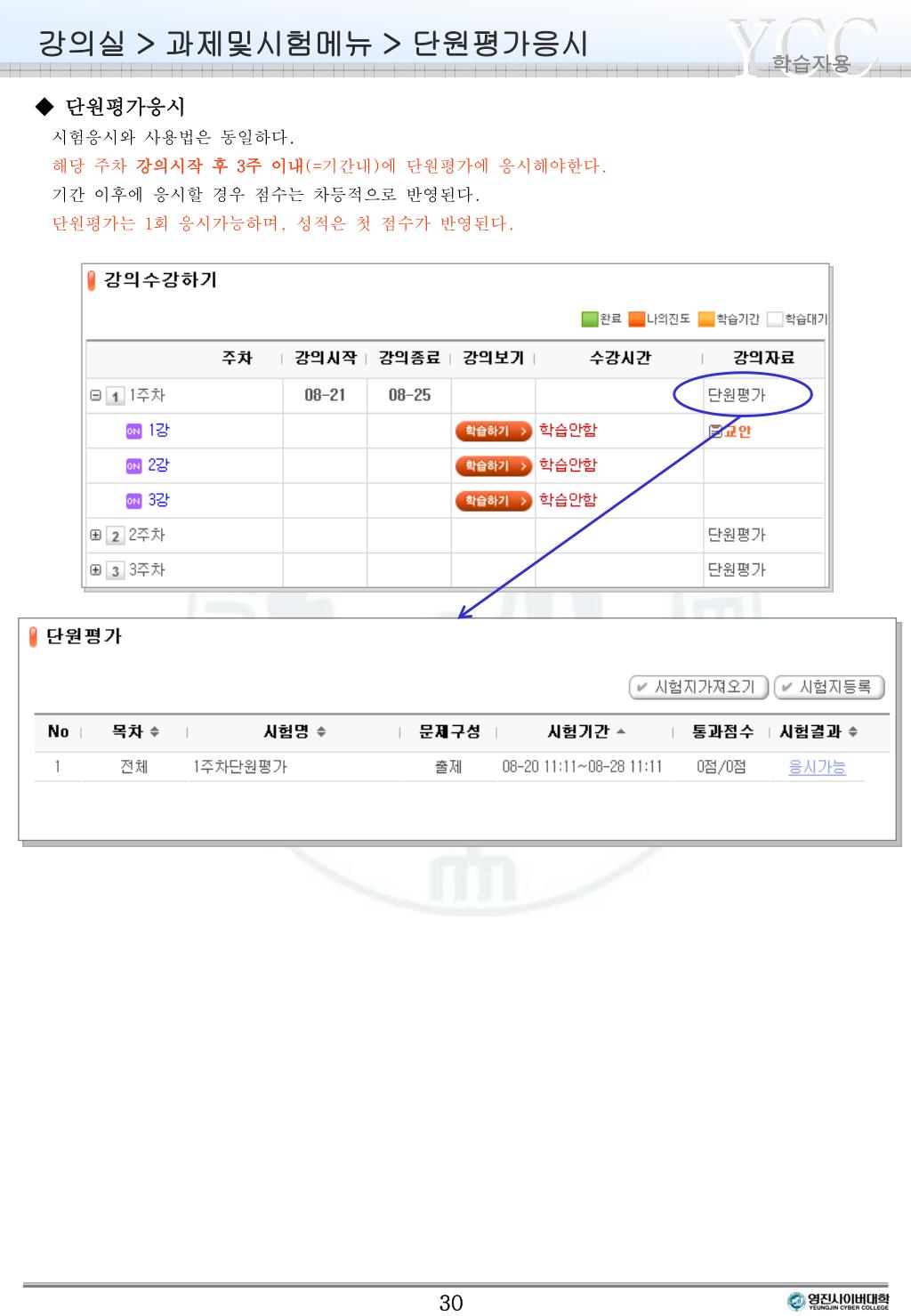 강의실 > 과제및시험메뉴 > 단원평가응시 ◆ 단원평가응시 시험응시와 사용법은 동일하다. 해당 주차 강의시작 후 3주 이내(=기간내)에 단원평가에 응시해야한다. 기간 이후에 응시할 경우 점수는 차등적으로 반영된다. 단원평가는 1회 응시가능하며, 성적은 첫 점수가 반영된다.
