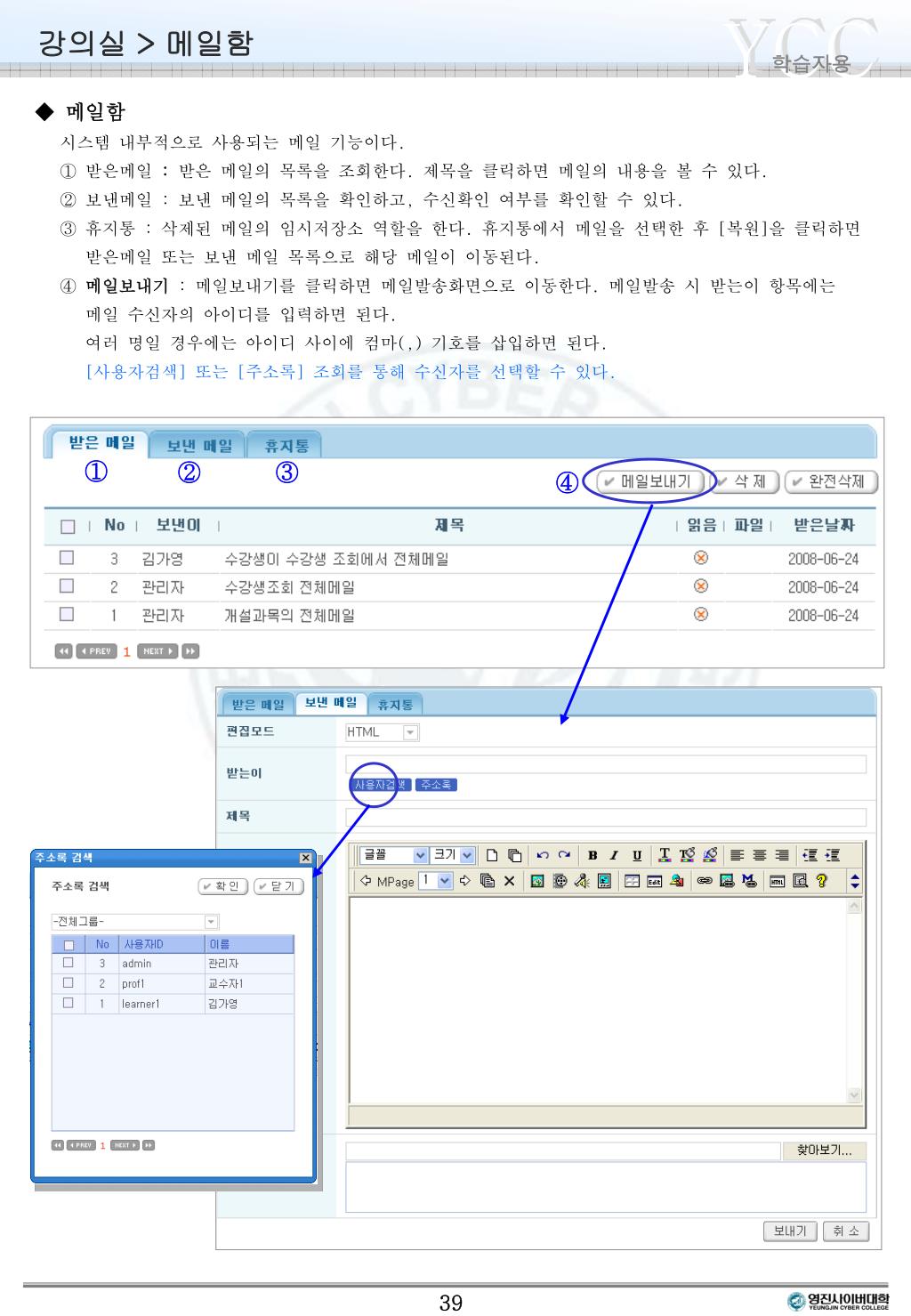 강의실 > 메일함 ◆ 메일함 시스템 내부적으로 사용되는 메일 기능이다. ①받은메일: 받은 메일의 목록을 조회한다. 제목을 클릭하면 메일의 내용을 볼 수 있다. ② 보낸메일 : 보낸 메일의 목록을 확인하고, 수신확인 여부를 확인할 수 있다. ③ 휴지통 : 삭제된 메일의 임시저장소 역할을 한다. 휴지통에서 메일을 선택한 후 [복원]을 클릭하면 받은메일 또는 보낸 메일 목록으로 해당 메일이 이동된다. ④ 메일보내기 : 메일보내기를 클릭하면 메일발송화면으로 이동한다. 메일발송 시 받는이 항목에는 메일 수신자의 아이디를 입력하면 된다. 여러 명일 경우에는 아이디 사이에 컴마(,) 기호를 삽입하면 된다. [사용자검색] 또는 [주소록] 조회를 통해 수신자를 선택할 수 있다. ① ② ③ ④