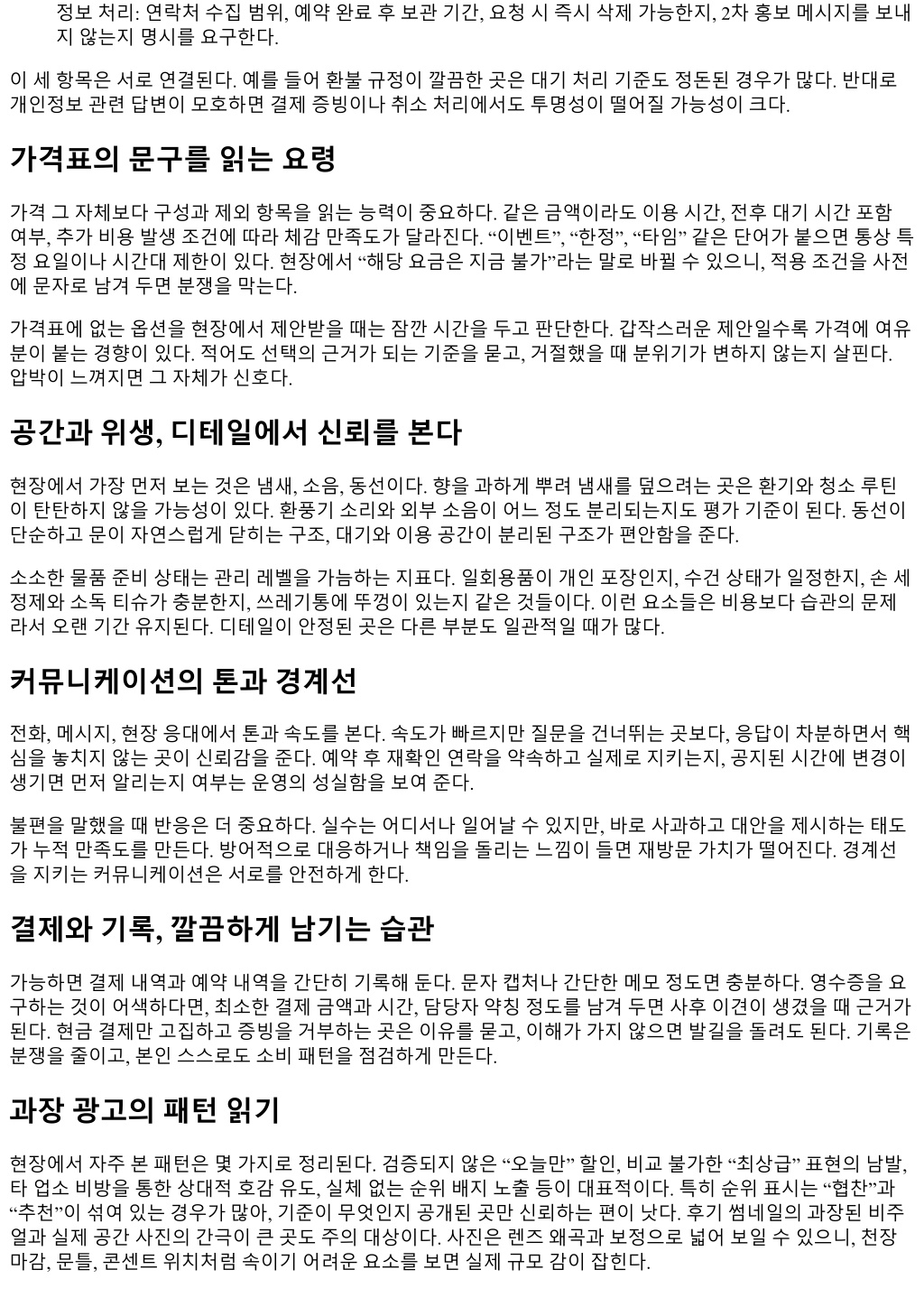 정보처리: 연락처수집범위, 예약완료후보관기간, 요청시즉시삭제가능한지, 2차홍보메시지를보내 지않는지명시를요구한다. 이세항목은서로연결된다. 예를들어환불규정이깔끔한곳은대기처리기준도정돈된경우가많다. 반대로 개인정보관련답변이모호하면결제증빙이나취소처리에서도투명성이떨어질가능성이크다. 가격표의문구를읽는요령 가격그자체보다구성과제외항목을읽는능력이중요하다. 같은금액이라도이용시간, 전후대기시간포함 여부, 추가비용발생조건에따라체감만족도가달라진다. “이벤트”, “한정”, “타임” 같은단어가붙으면통상특 정요일이나시간대제한이있다. 현장에서 “해당요금은지금불가”라는말로바뀔수있으니, 적용조건을사전 에문자로남겨두면분쟁을막는다. 가격표에없는옵션을현장에서제안받을때는잠깐시간을두고판단한다. 갑작스러운제안일수록가격에여유 분이붙는경향이있다. 적어도선택의근거가되는기준을묻고, 거절했을때분위기가변하지않는지살핀다. 압박이느껴지면그자체가신호다. 공간과위생, 디테일에서신뢰를본다 현장에서가장먼저보는것은냄새, 소음, 동선이다. 향을과하게뿌려냄새를덮으려는곳은환기와청소루틴 이탄탄하지않을가능성이있다. 환풍기소리와외부소음이어느정도분리되는지도평가기준이된다. 동선이 단순하고문이자연스럽게닫히는구조, 대기와이용공간이분리된구조가편안함을준다. 소소한물품준비상태는관리레벨을가늠하는지표다. 일회용품이개인포장인지, 수건상태가일정한지, 손세 정제와소독티슈가충분한지, 쓰레기통에뚜껑이있는지같은것들이다. 이런요소들은비용보다습관의문제 라서오랜기간유지된다. 디테일이안정된곳은다른부분도일관적일때가많다. 커뮤니케이션의톤과경계선 전화, 메시지, 현장응대에서톤과속도를본다. 속도가빠르지만질문을건너뛰는곳보다, 응답이차분하면서핵 심을놓치지않는곳이신뢰감을준다. 예약후재확인연락을약속하고실제로지키는지, 공지된시간에변경이 생기면먼저알리는지여부는운영의성실함을보여준다. 불편을말했을때반응은더중요하다. 실수는어디서나일어날수있지만, 바로사과하고대안을제시하는태도 가누적만족도를만든다. 방어적으로대응하거나책임을돌리는느낌이들면재방문가치가떨어진다. 경계선 을지키는커뮤니케이션은서로를안전하게한다. 결제와기록, 깔끔하게남기는습관 가능하면결제내역과예약내역을간단히기록해둔다. 문자캡처나간단한메모정도면충분하다. 영수증을요 구하는것이어색하다면, 최소한결제금액과시간, 담당자약칭정도를남겨두면사후이견이생겼을때근거가 된다. 현금결제만고집하고증빙을거부하는곳은이유를묻고, 이해가가지않으면발길을돌려도된다. 기록은 분쟁을줄이고, 본인스스로도소비패턴을점검하게만든다. 과장광고의패턴읽기 현장에서자주본패턴은몇가지로정리된다. 검증되지않은 “오늘만” 할인, 비교불가한 “최상급” 표현의남발, 타업소비방을통한상대적호감유도, 실체없는순위배지노출등이대표적이다. 특히순위표시는 “협찬”과 “추천”이섞여있는경우가많아, 기준이무엇인지공개된곳만신뢰하는편이낫다. 후기썸네일의과장된비주 얼과실제공간사진의간극이큰곳도주의대상이다. 사진은렌즈왜곡과보정으로넓어보일수있으니, 천장 마감, 문틀, 콘센트위치처럼속이기어려운요소를보면실제규모감이잡힌다.