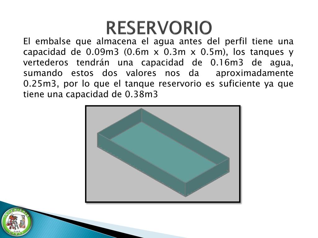 RESERVORIO El embalse que almacena el agua antes del perfil tiene una capacidad de 0.09m3 (0.6m x 0.3m x 0.5m), los tanques y vertederos tendrán una capacidad de 0.16m3 de agua, sumando estos dos valores nos da aproximadamente 0.25m3, por lo que el tanque reservorio es suficiente ya que tiene una capacidad de 0.38m3