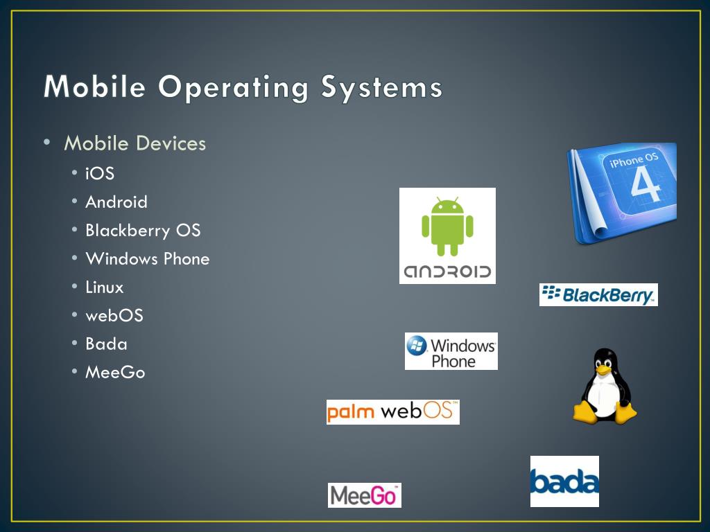 Mobile Operating Systems • Mobile Devices • iOS • Android • Blackberry OS • Windows Phone • Linux • webOS • Bada • MeeGo