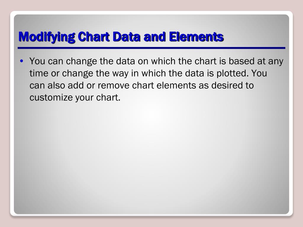Modifying Chart Data and Elements • You can change the data on which the chart is based at any time or change the way in which the data is plotted. You can also add or remove chart elements as desired to customize your chart.