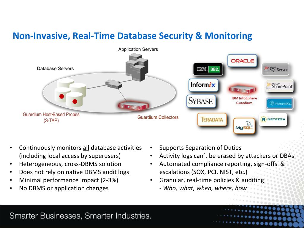 Non-Invasive, Real-Time Database Security & Monitoring • Supports Separation of Duties • Activity logs can’t be erased by attackers or DBAs • Automated compliance reporting, sign-offs & escalations (SOX, PCI, NIST, etc.) • Granular, real-time policies & auditing- Who, what, when, where, how • Continuously monitors all database activities (including local access by superusers) • Heterogeneous, cross-DBMS solution • Does not rely on native DBMS audit logs • Minimal performance impact (2-3%) • No DBMS or application changes