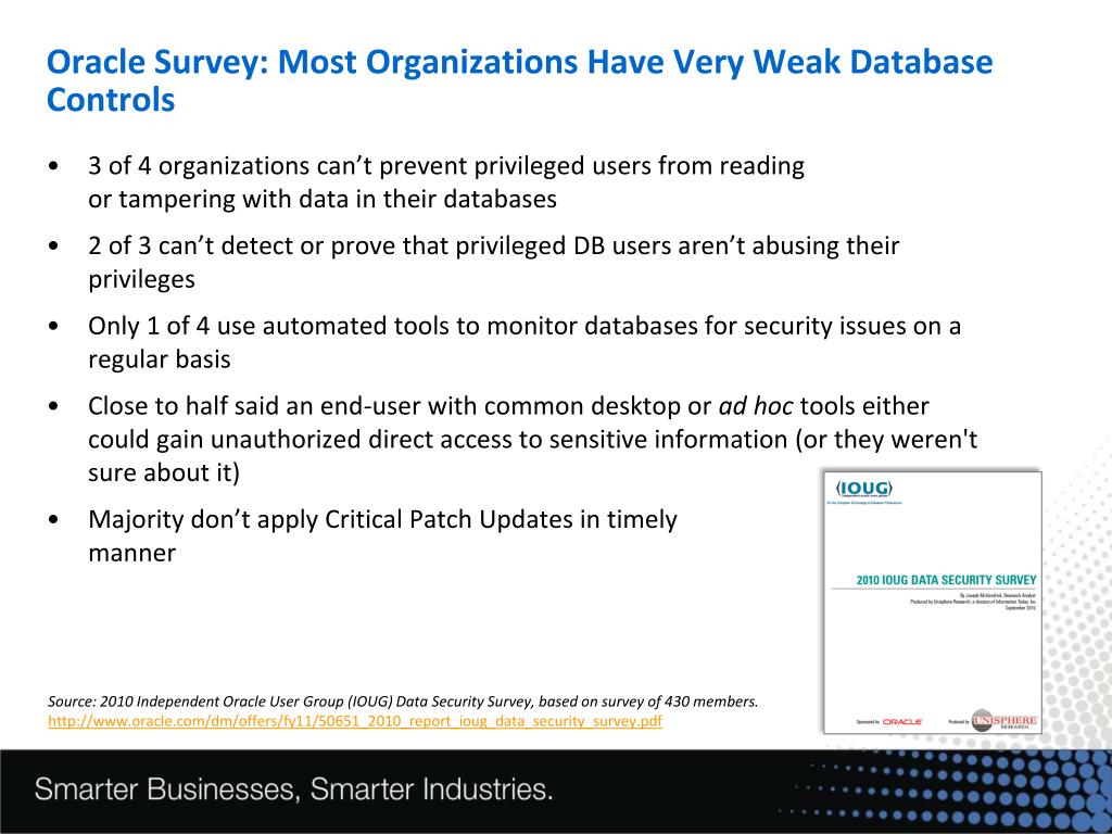 Oracle Survey: Most Organizations Have Very Weak Database Controls • 3 of 4 organizations can’t prevent privileged users from reading or tampering with data in their databases • 2 of 3 can’t detect or prove that privileged DB users aren’t abusing their privileges • Only 1 of 4 use automated tools to monitor databases for security issues on a regular basis • Close to half said an end-user with common desktop or ad hoc tools either could gain unauthorized direct access to sensitive information (or they weren't sure about it) • Majority don’t apply Critical Patch Updates in timely manner Source: 2010 Independent Oracle User Group (IOUG) Data Security Survey, based on survey of 430 members. http://www.oracle.com/dm/offers/fy11/50651_2010_report_ioug_data_security_survey.pdf