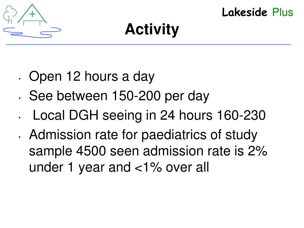Activity • Open 12 hours a day • See between 150-200 per day • Local DGH seeing in 24 hours 160-230 • Admission rate for paediatrics of study sample 4500 seen admission rate is 2% under 1 year and <1% over all