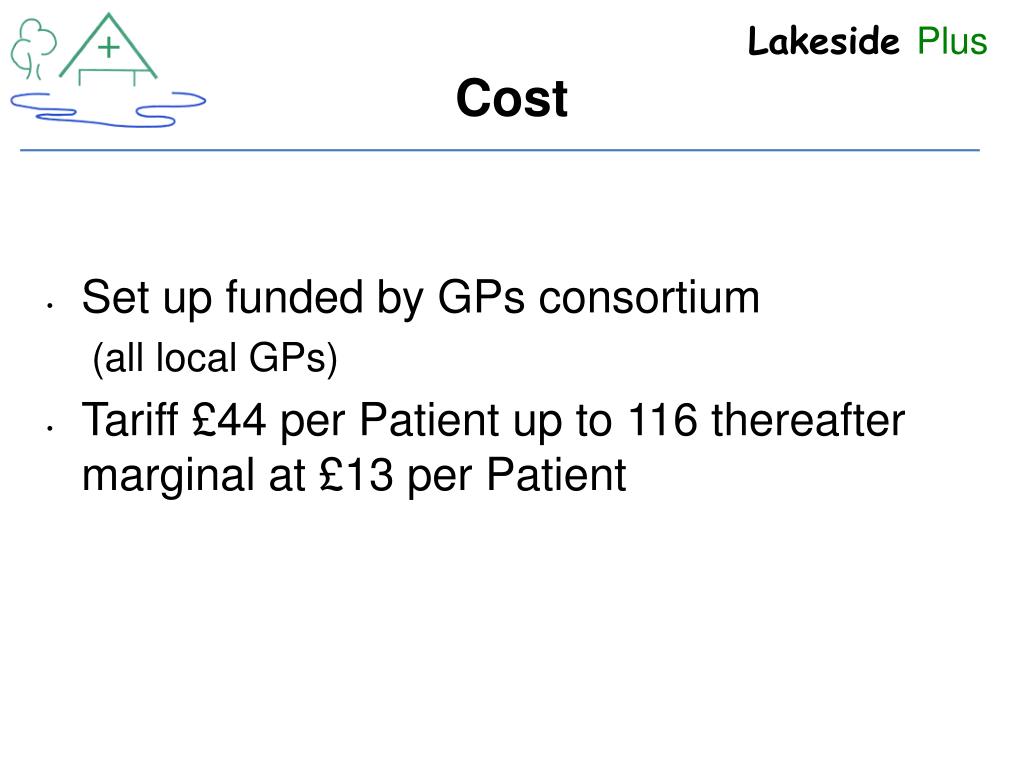 Cost • Set up funded by GPs consortium (all local GPs) • Tariff £44 per Patient up to 116 thereafter marginal at £13 per Patient