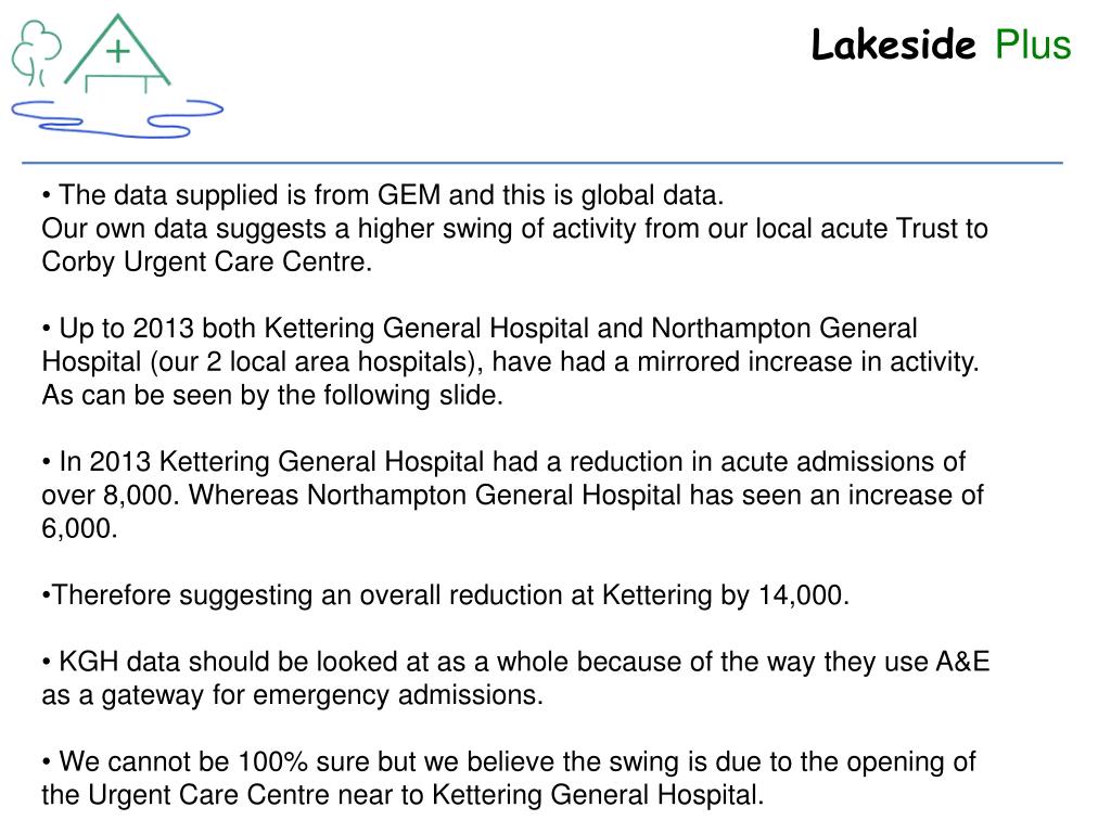 The data supplied is from GEM and this is global data. Our own data suggests a higher swing of activity from our local acute Trust to Corby Urgent Care Centre. • Up to 2013 both Kettering General Hospital and Northampton General Hospital (our 2 local area hospitals), have had a mirrored increase in activity. As can be seen by the following slide. • In 2013 Kettering General Hospital had a reduction in acute admissions of over 8,000. Whereas Northampton General Hospital has seen an increase of 6,000. • Therefore suggesting an overall reduction at Kettering by 14,000. • KGH data should be looked at as a whole because of the way they use A&E as a gateway for emergency admissions. • We cannot be 100% sure but we believe the swing is due to the opening of the Urgent Care Centre near to Kettering General Hospital.