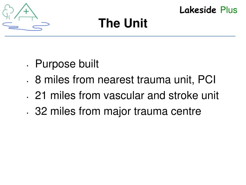 The Unit • Purpose built • 8 miles from nearest trauma unit, PCI • 21 miles from vascular and stroke unit • 32 miles from major trauma centre