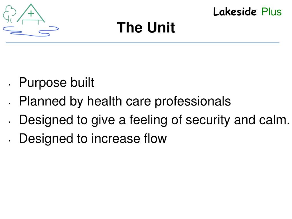 The Unit • Purpose built • Planned by health care professionals • Designed to give a feeling of security and calm. • Designed to increase flow