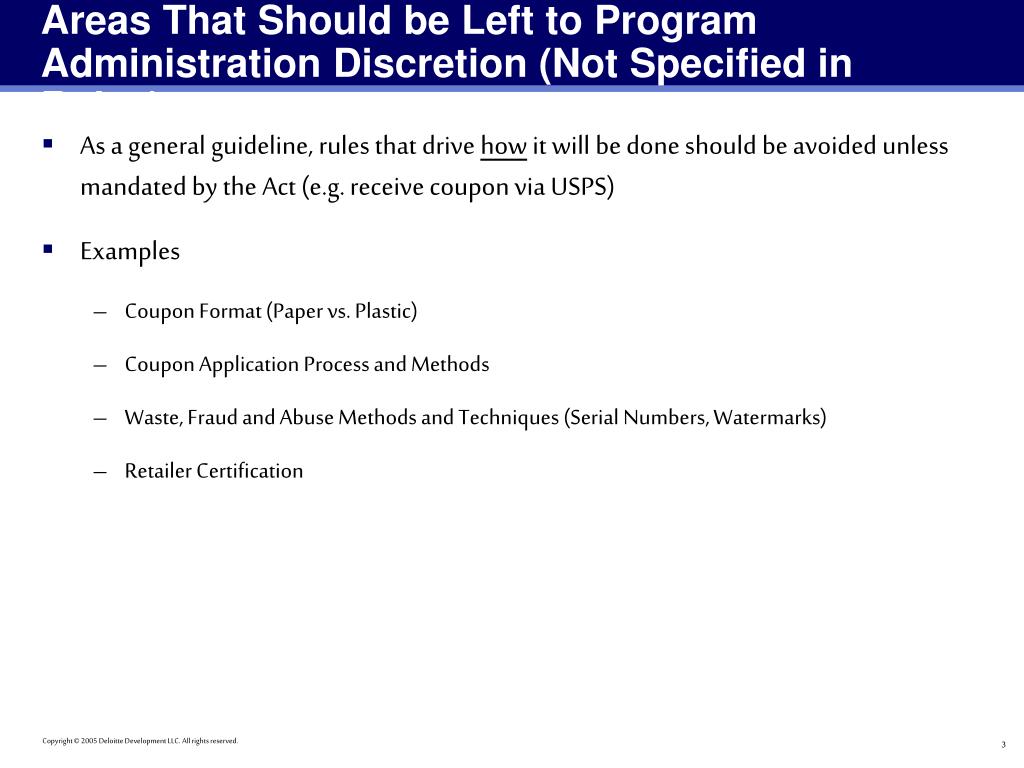 Areas That Should be Left to Program Administration Discretion (Not Specified in Rules) • As a general guideline, rules that drive how it will be done should be avoided unless mandated by the Act (e.g. receive coupon via USPS) • Examples • Coupon Format (Paper vs. Plastic) • Coupon Application Process and Methods • Waste, Fraud and Abuse Methods and Techniques (Serial Numbers, Watermarks) • Retailer Certification