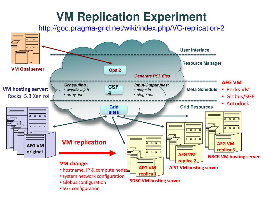 VM Replication Experimenthttp://goc.pragma-grid.net/wiki/index.php/VC-replication-2 User Interface Resource Manager Opal2 Generate RSL files • AFG VM • Rocks VM • Globus/SGE • Autodock • Scheduling : • workflow job • array Job • Input/Output files: • stage in • stage out Meta Scheduler CSF4 VM hosting server: Rocks 5.3 Xen roll Grid Resources Grid sites AFG VM replica 1 AFG VM replica 2 AFG VM replica 3 VM replication AFG VM original • VM change: • hostname, IP & compute nodes • system network configuration • Globus configuration • SGE configuration VM Opal server NBCR VM hosting server SDSC VM hosting server AIST VM hosting server