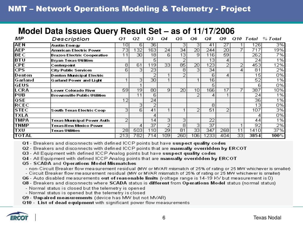 NMT – Network Operations Modeling & Telemetry - Project Model Data Issues Query Result Set – as of 11/17/2006 6 Texas Nodal
