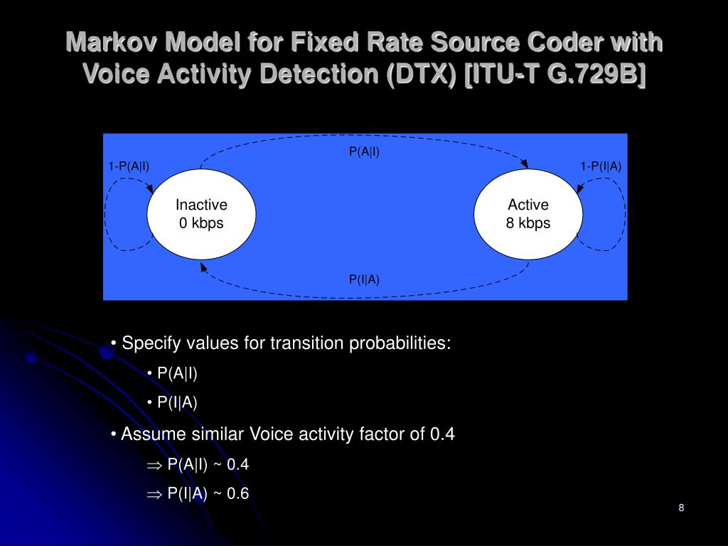 Markov Model for Fixed Rate Source Coder with Voice Activity Detection (DTX) [ITU-T G.729B] • Specify values for transition probabilities: • P(A|I) • P(I|A) • Assume similar Voice activity factor of 0.4 • P(A|I) ~ 0.4 • P(I|A) ~ 0.6