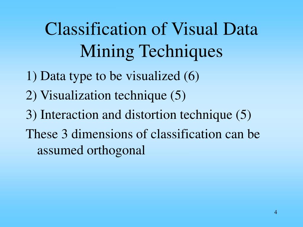 Classification of Visual Data Mining Techniques 1) Data type to be visualized (6) 2) Visualization technique (5) 3) Interaction and distortion technique (5) These 3 dimensions of classification can be assumed orthogonal