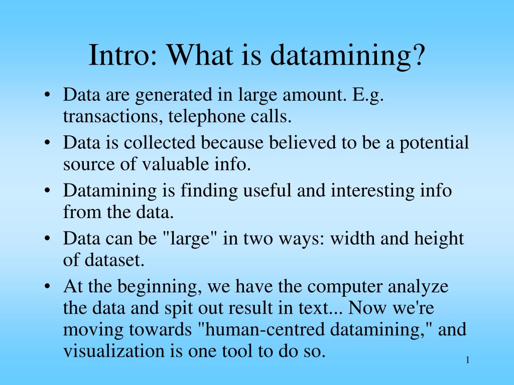 Intro: What is datamining? • Data are generated in large amount. E.g. transactions, telephone calls. • Data is collected because believed to be a potential source of valuable info. • Datamining is finding useful and interesting info from the data. • Data can be "large" in two ways: width and height of dataset. • At the beginning, we have the computer analyze the data and spit out result in text... Now we're moving towards "human-centred datamining," and visualization is one tool to do so.