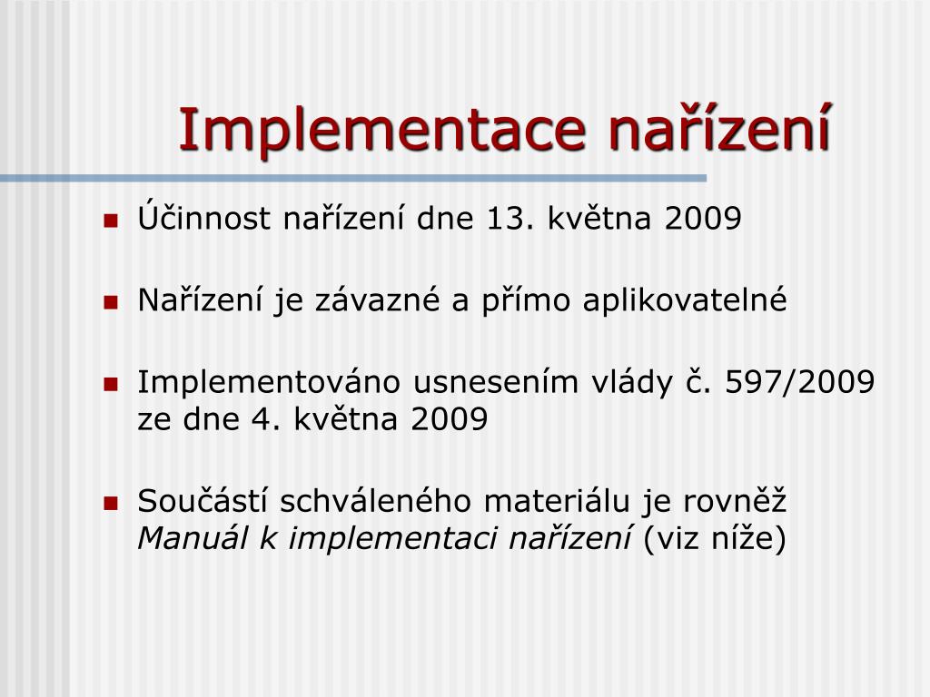 Implementace nařízení • Účinnost nařízení dne 13. května 2009 • Nařízení je závazné a přímo aplikovatelné • Implementováno usnesením vlády č. 597/2009 ze dne 4. května 2009 • Součástí schváleného materiálu je rovněž Manuál k implementaci nařízení (viz níže)