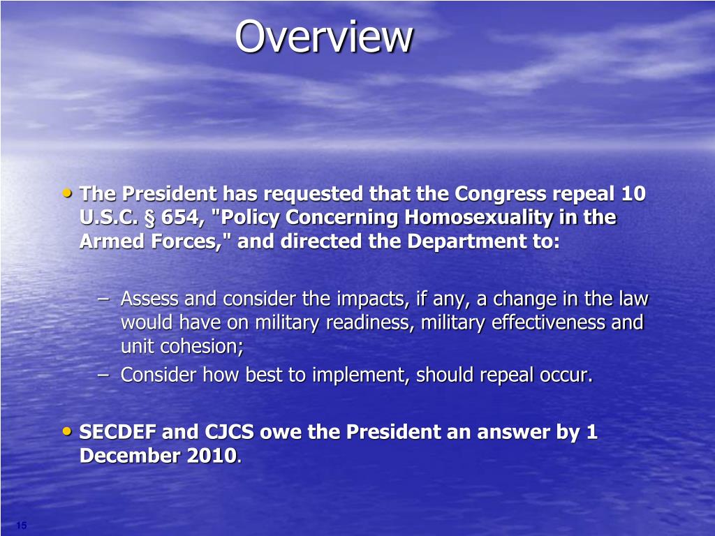 Overview • The President has requested that the Congress repeal 10 U.S.C. § 654, "Policy Concerning Homosexuality in the Armed Forces," and directed the Department to: • Assess and consider the impacts, if any, a change in the law would have on military readiness, military effectiveness and unit cohesion; • Consider how best to implement, should repeal occur. • SECDEF and CJCS owe the President an answer by 1 December 2010. 15