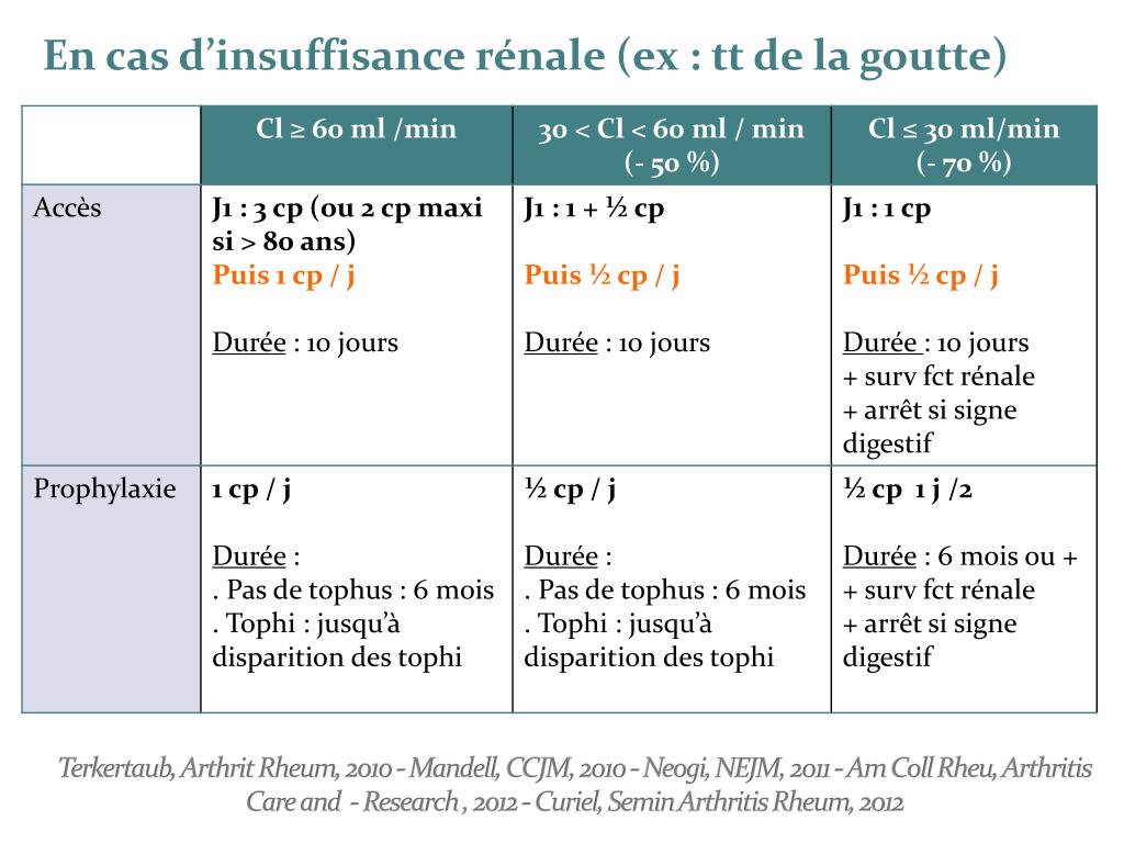 En cas d’insuffisance rénale (ex : tt de la goutte) Terkertaub, ArthritRheum, 2010 - Mandell, CCJM, 2010 - Neogi, NEJM, 2011 - Am CollRheu, Arthritis Care and - Research , 2012 - Curiel, SeminArthritisRheum, 2012