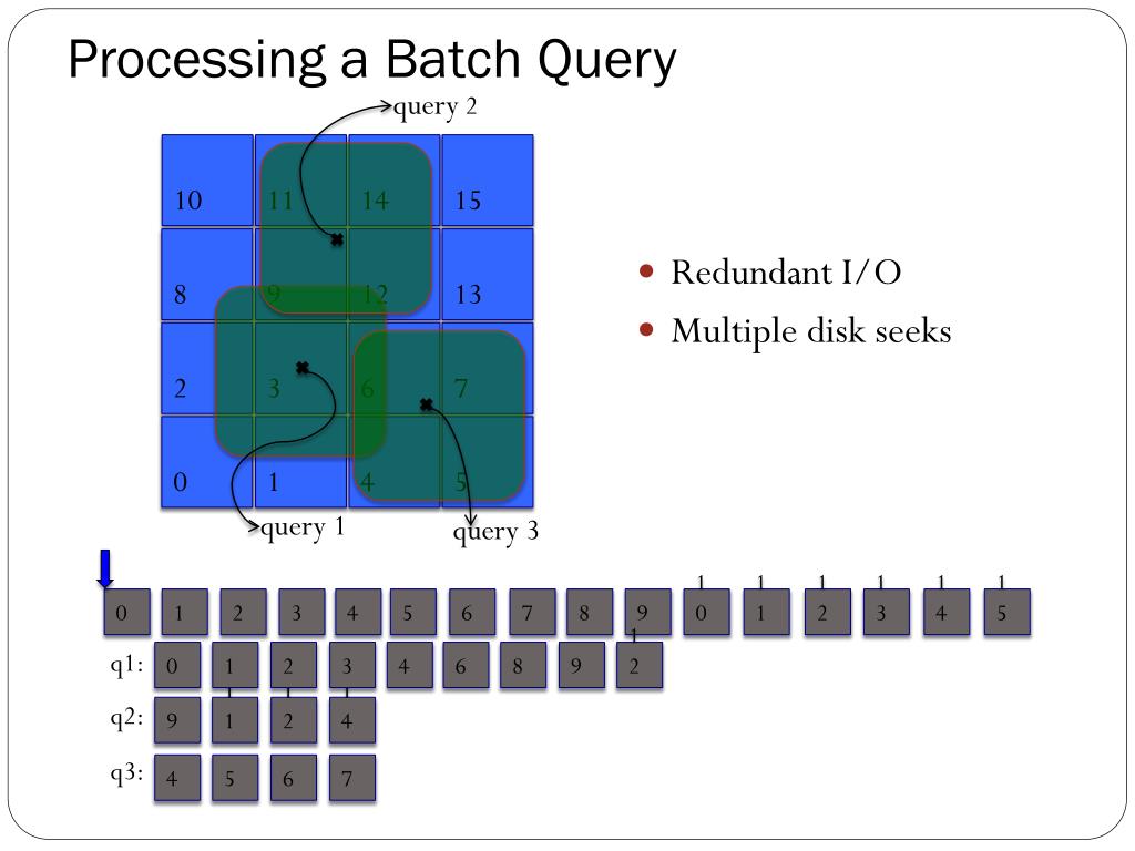 Processing a Batch Query query 2 10 11 14 15 • Redundant I/O • Multiple disk seeks 8 9 12 13 2 3 6 7 0 1 4 5 query 1 query 3 0 1 2 3 4 5 6 7 8 9 10 11 12 13 14 15 0 1 2 3 4 6 8 9 12 q1: 9 11 12 14 q2: q3: 4 5 6 7