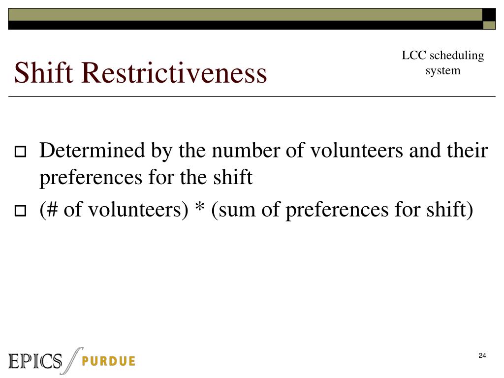 Shift Restrictiveness Determined by the number of volunteers and their preferences for the shift (# of volunteers) * (sum of preferences for shift) LCC scheduling system