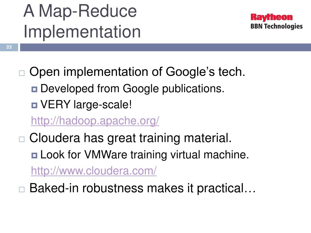 A Map-Reduce Implementation • Open implementation of Google’s tech. • Developed from Google publications. • VERY large-scale! http://hadoop.apache.org/ • Cloudera has great training material. • Look for VMWare training virtual machine. http://www.cloudera.com/ • Baked-in robustness makes it practical…