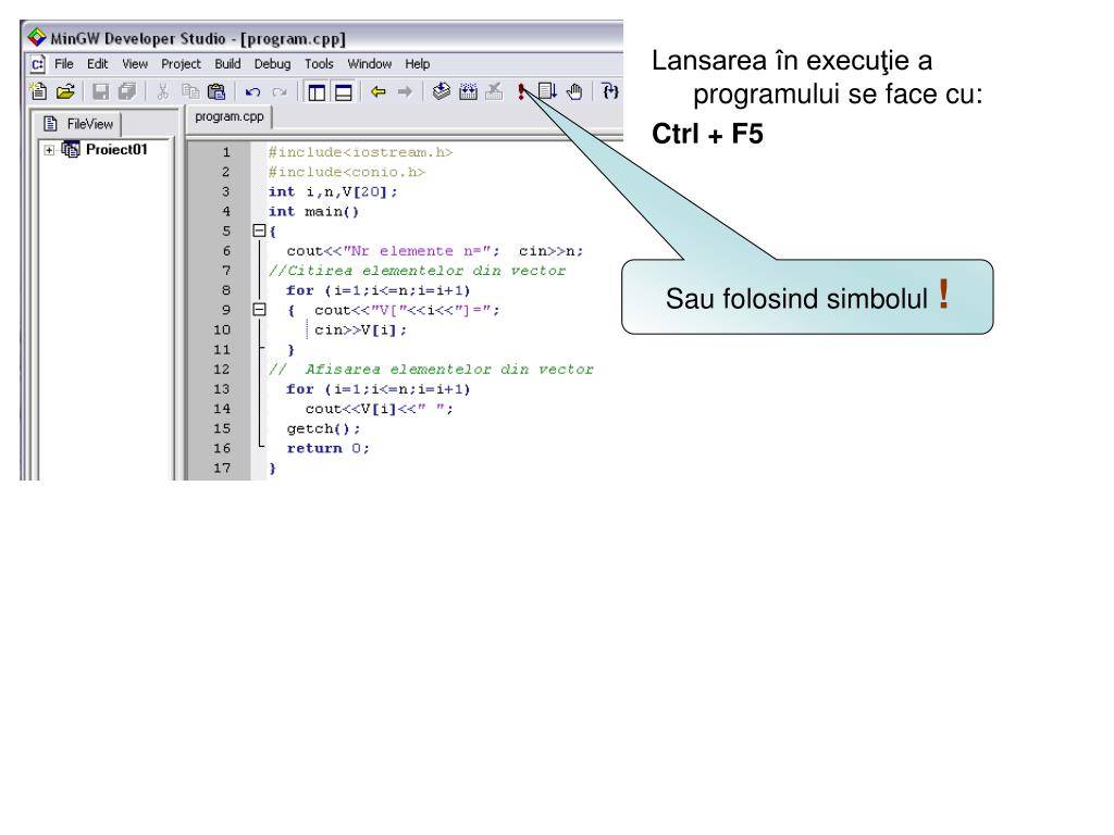 Lansarea în execuţie a programului se face cu: Ctrl + F5 Sau folosind simbolul !