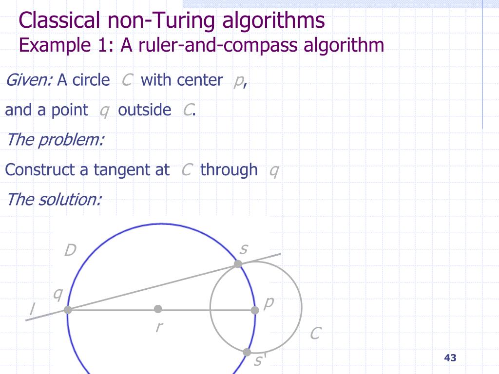D s q p l r C s‘ Classical non-Turing algorithmsExample 1: A ruler-and-compass algorithm Given: A circle C with center p, and a point q outside C. The problem: Construct a tangent at C through q The solution: