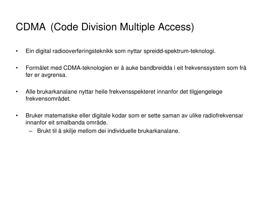 CDMA(Code Division Multiple Access) • Ein digital radiooverføringsteknikk som nyttar spreidd-spektrum-teknologi. • Formålet med CDMA-teknologien er å auke bandbreidda i eit frekvenssystem som frå før er avgrensa. • Alle brukarkanalane nyttar heile frekvensspekteret innanfor det tilgjengelege frekvensområdet. • Bruker matematiske eller digitale kodar som er sette saman av ulike radiofrekvensar innanfor eit smalbanda område. • Brukt til å skilje mellom dei individuelle brukarkanalane.