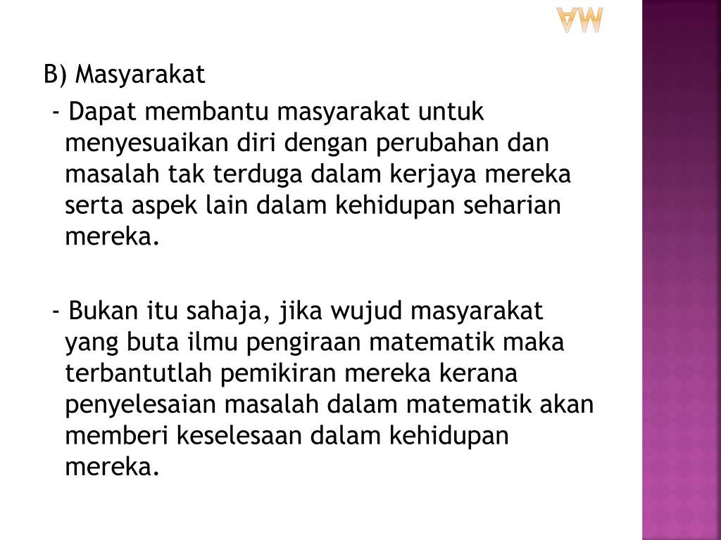 ma B) Masyarakat - Dapatmembantumasyarakatuntukmenyesuaikandiridenganperubahandanmasalahtakterdugadalamkerjayamerekasertaaspek lain dalamkehidupanseharianmereka. - Bukanitusahaja, jikawujudmasyarakat yang butailmupengiraanmatematikmakaterbantutlahpemikiranmerekakeranapenyelesaianmasalahdalammatematikakanmemberikeselesaandalamkehidupanmereka.