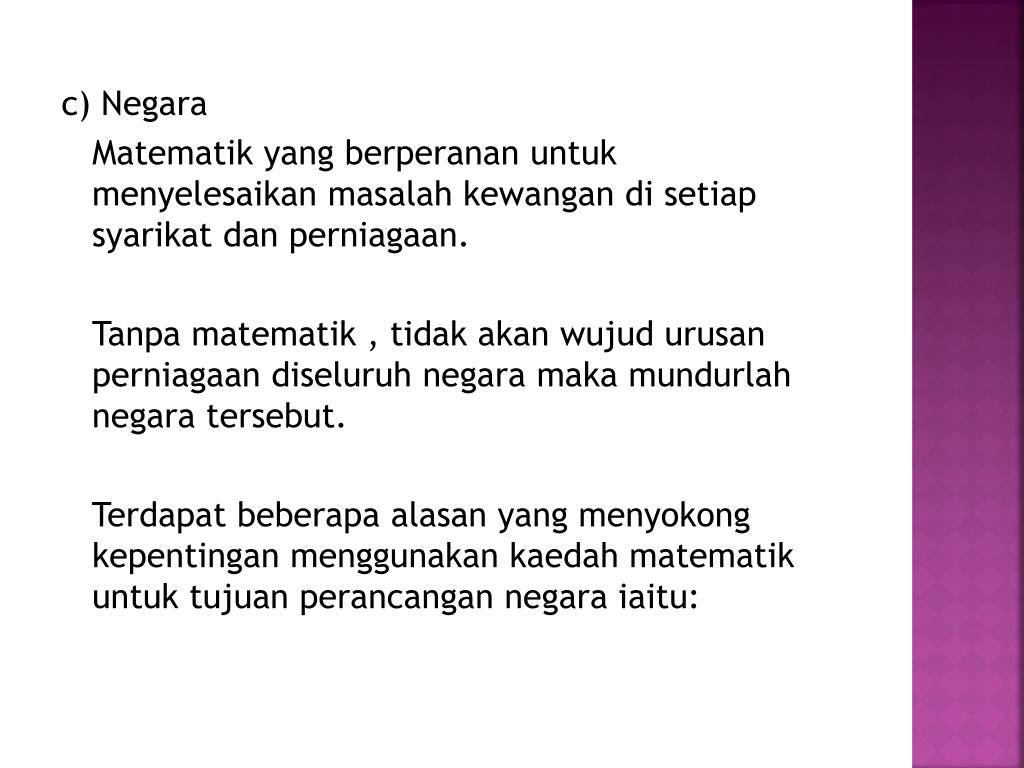 c) Negara Matematik yang berperananuntukmenyelesaikanmasalahkewangandisetiapsyarikatdanperniagaan. Tanpamatematik , tidakakanwujudurusanperniagaandiseluruhnegaramakamundurlahnegaratersebut. Terdapat beberapa alasan yang menyokong kepentingan menggunakan kaedah matematik untuk tujuan perancangan negara iaitu: