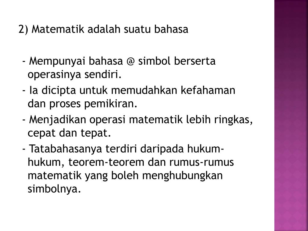 2) Matematikadalahsuatubahasa - Mempunyaibahasa @ simbolbersertaoperasinyasendiri. - Iadiciptauntukmemudahkankefahamandanprosespemikiran. - Menjadikanoperasimatematiklebihringkas, cepatdantepat. - Tatabahasanyaterdiridaripadahukum-hukum, teorem-teoremdanrumus-rumusmatematik yang bolehmenghubungkansimbolnya.