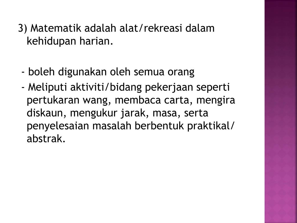 3) Matematikadalahalat/rekreasidalamkehidupanharian. - bolehdigunakanolehsemuaorang - Meliputiaktiviti/bidangpekerjaansepertipertukaranwang, membacacarta, mengiradiskaun, mengukurjarak, masa, sertapenyelesaianmasalahberbentukpraktikal/ abstrak.