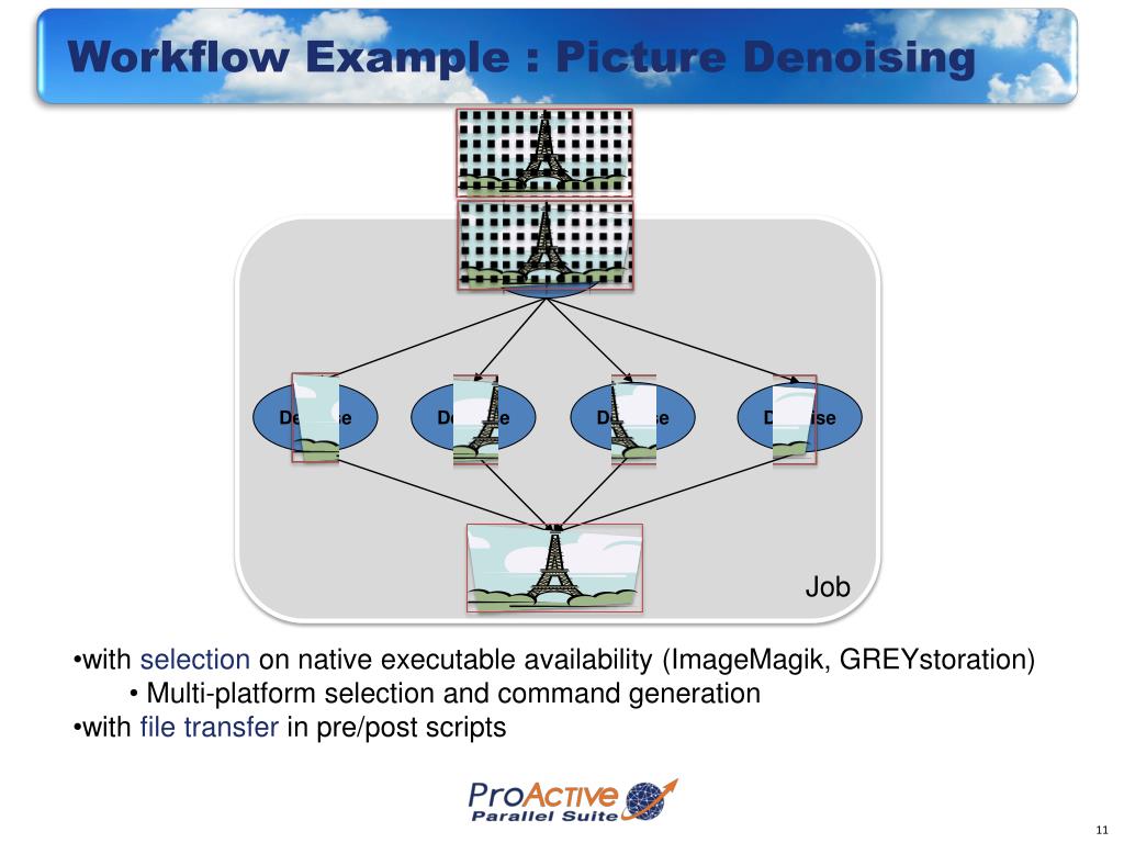 Workflow Example : Picture Denoising Split Denoise Denoise Denoise Denoise Merge • with selection on native executable availability (ImageMagik, GREYstoration) • Multi-platform selection and command generation • with file transfer in pre/post scripts Job