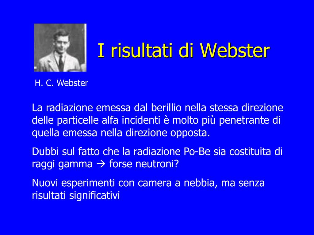 I risultati di Webster H. C. Webster La radiazione emessa dal berillio nella stessa direzione delle particelle alfa incidenti è molto più penetrante di quella emessa nella direzione opposta. Dubbi sul fatto che la radiazione Po-Be sia costituita di raggi gamma forse neutroni? Nuovi esperimenti con camera a nebbia, ma senza risultati significativi