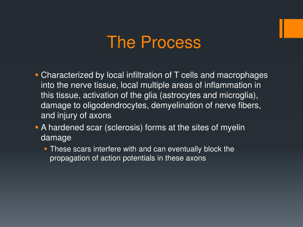 The Process • Characterized by local infiltration of T cells and macrophages into the nerve tissue, local multiple areas of inflammation in this tissue, activation of the glia (astrocytes and microglia), damage to oligodendrocytes, demyelination of nerve fibers, and injury of axons • A hardened scar (sclerosis) forms at the sites of myelin damage • These scars interfere with and can eventually block the propagation of action potentials in these axons