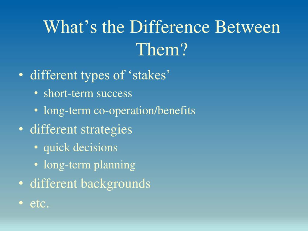 What’s the Difference Between Them? • different types of ‘stakes’ • short-term success • long-term co-operation/benefits • different strategies • quick decisions • long-term planning • different backgrounds • etc.